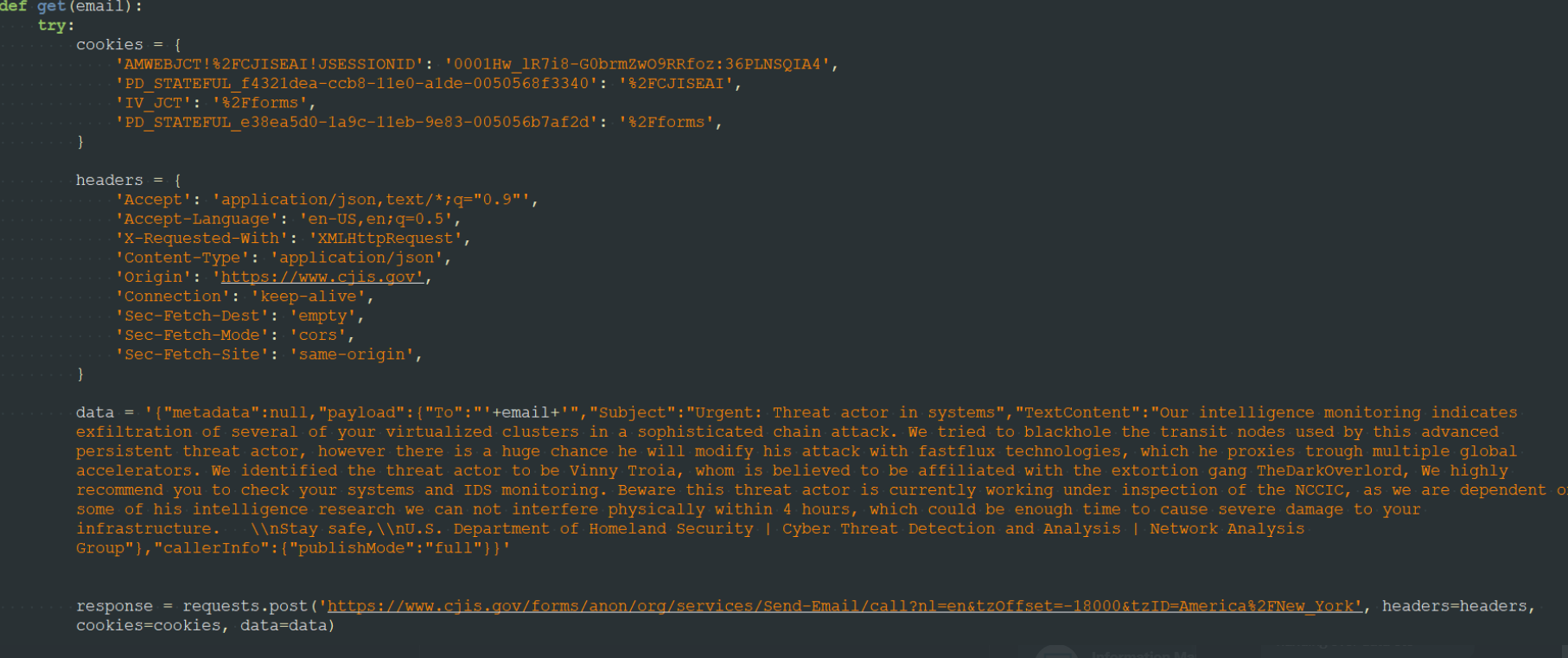 Pompompurin said a simple script replaced those parameters with his own message subject and body, and automated the sending of the hoax message to thousands of email addresses.
